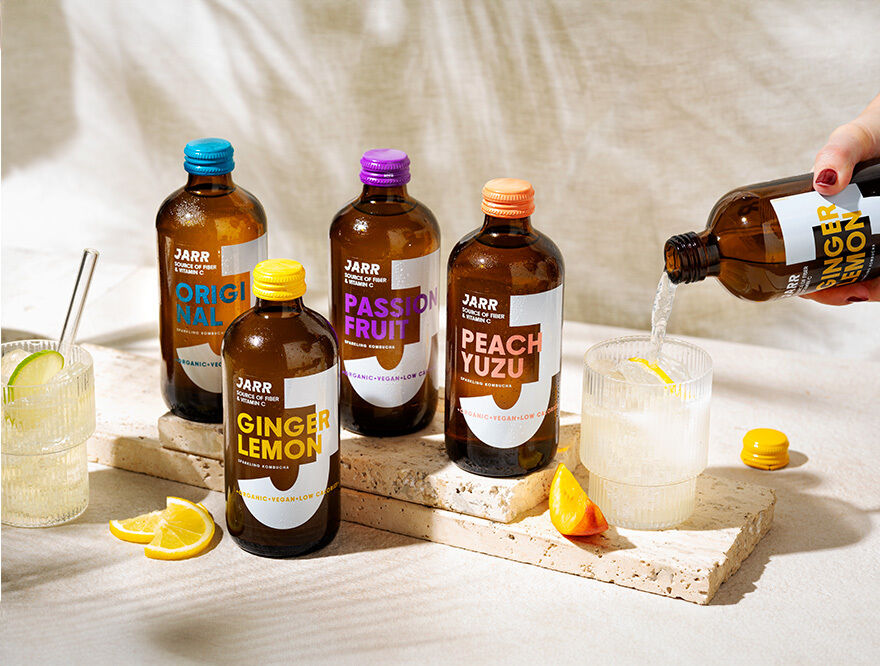 JARR Kombucha is a London-based brand offering fresh, fizzy, probiotic-rich fermented tea. Each 330ml bottle is brewed with real tea leaves, organic cane sugar, and a live culture (SCOBY), then flavored with natural ingredients. With less than 0.5% ABV, it’s alcohol-free and health-focused — a perfect replacement for sugary sodas or alcohol at any time of day.